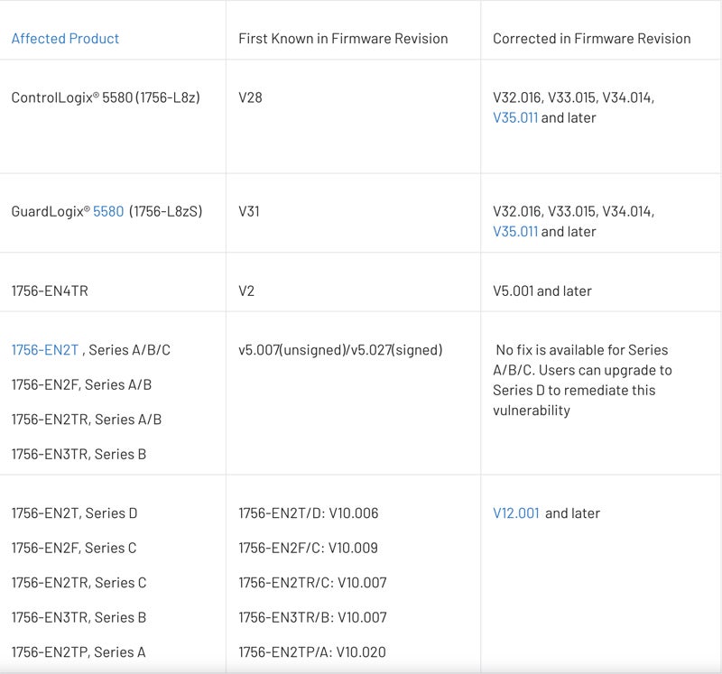 The fix: Rockwell Automation provided the following table with the fixed firmware versions for each affected product.
