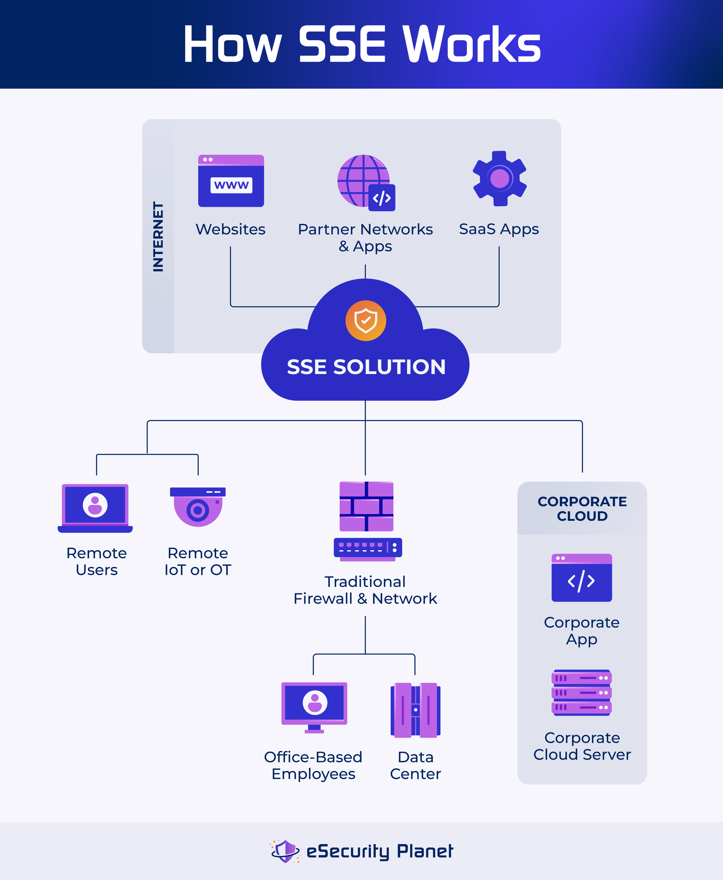 Traditional network security can only secure traffic rerouted into the local network using VPNs, so many users directly connect to SaaS apps and websites without sufficient protection. SSE extends security to all users, Internet of Things (IoT), operations technology (OT), cloud assets, and applications that reside outside of the internal network.