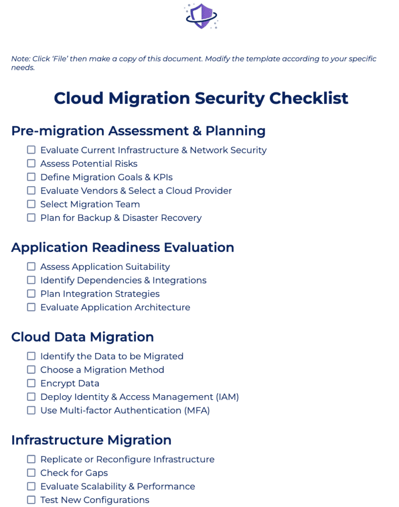 We’ve created a sample checklist for implementing secure cloud migration processes. Click the image below to download the file and customize your own cloud migration security checklist. Then, continue reading below to see our step-by-step explanation on how to perform each task on the checklist.