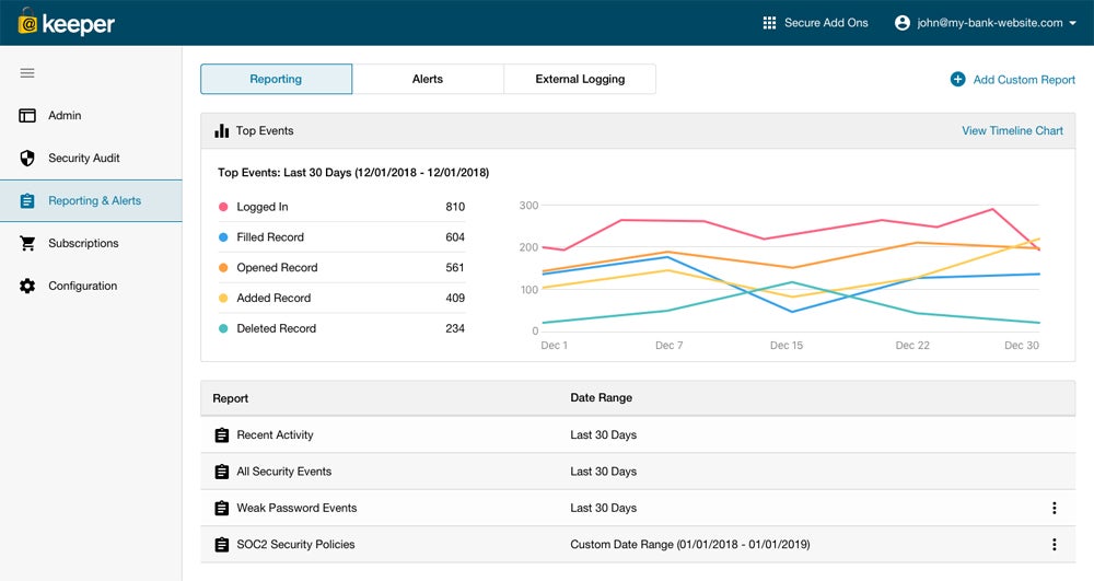 Keeper is a sophisticated password manager that also offers add-ons like the Secret Manager and a module for advanced alerts. Keeper has a plan for managed service providers (MSPs) that offers tools like reports on security information and event management (SIEM) events, if you’re looking for something similar to LastPass’s SIEM integrations. Keeper’s management console allows customers to manage their tenants, or Managed Companies, from one location.