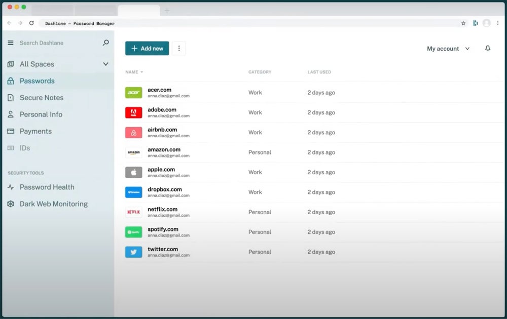 Dashlane is a feature-rich password manager with a modern design that organizes passwords, bank information, and personal information such as IDs and passports. It’s an ideal solution for users who value convenience in password management. Its identity dashboard is a standout feature, delivering dark web monitoring insights. Users can quickly address weak or compromised passwords via mobile, increasing overall security and simplicity of use.
