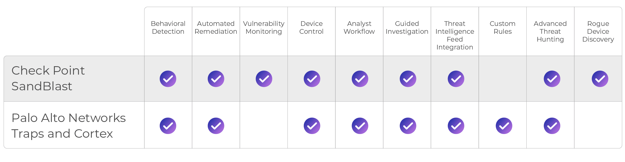 Check Point and Palo Alto, like all our top EDR vendors, offer a unified EDR/endpoint protection platform (EPP), machine learning-based threat detection, advanced fileless threat protection, and correlation and automatic indicators of compromise (IoC). Here’s how they break down in 10 other areas. Sophisticated security teams would bemoan Check Point’s lack of custom rules, while Palo Alto could offer its users better vulnerability and device control. Features aren’t always equal, of course. Palo Alto’s ability to detect unknown and offline attacks are a couple of the reasons why we think it offers the best security in the industry, while Check Point offers users great security at a compelling price point.