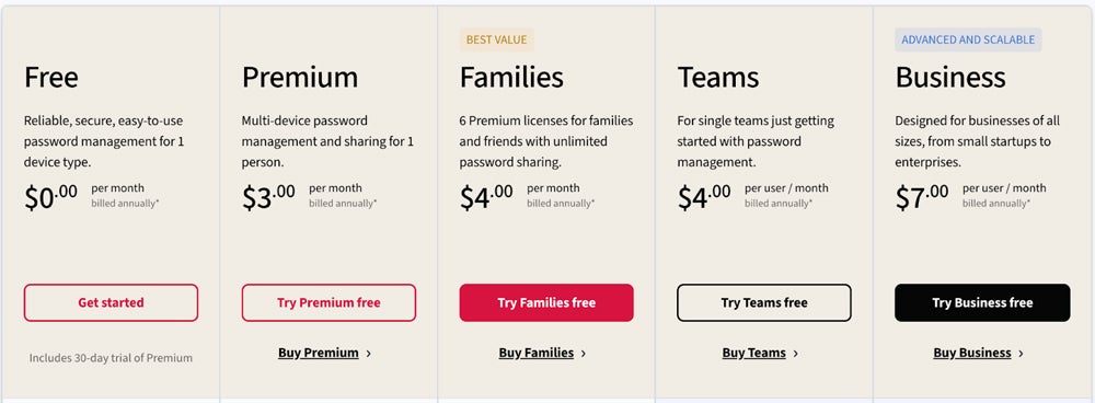 - Select the subscription plan from the LastPass website that best fits your needs, such as Free, Premium, Families, Teams, or Business.