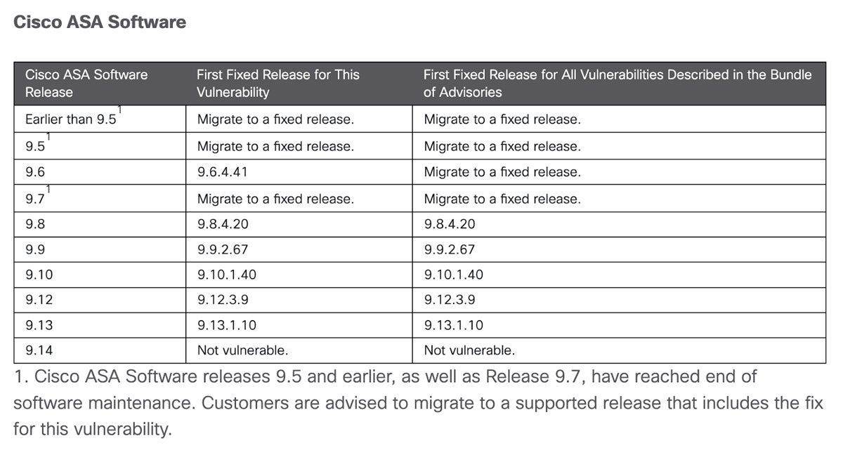 The fix: Cisco provides upgrade recommendations for the following affected versions: