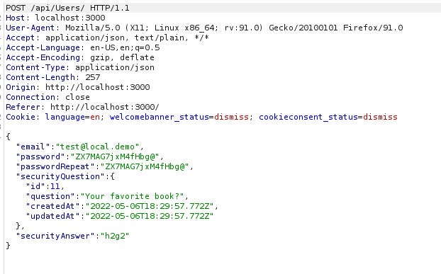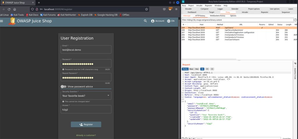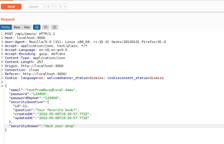 There are so many things to do with the Juicy Shop but let’s say we want to intercept the registration forms. We can emulate such an attack by opening Burp (make sure intercept is turned on) and submitting a form.